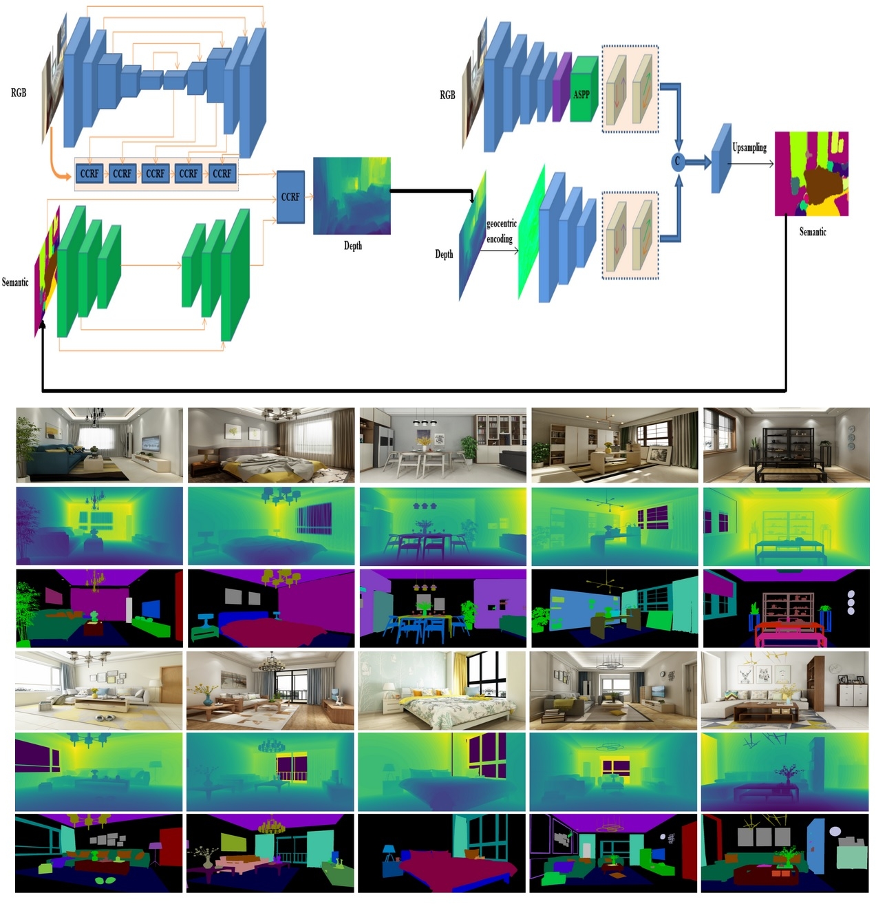 | This paper proposes a new method for simultaneous 3D reconstruction and semantic segmentation for indoor scenes. Our method only need a small number of (eg, 3-5) color images from uncalibrated sparse views, which significantly simplifies data acquisition and broadens applicable scenarios. We also make available a new indoor synthetic dataset, containing photorealistic high-resolution RGB images, accurate depth maps and pixel-level semantic labels for thousands of complex layouts. |