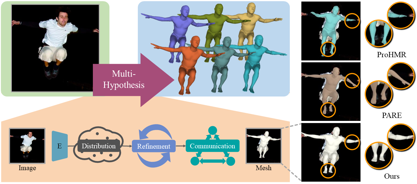 Haibiao Xuan, Jinsong Zhang, Kun Li. MHPro: Multi-Hypothesis Probabilistic Modeling for Human Mesh Recovery. Proceedings of the CAAI International Conference on Artificial Intelligence (CICAI), Beijing, China. 2022.