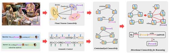 在以上研究的启发下,我学部韩亚洪教授的博士生武阿明同学提出新的视觉神经元组织和量化模型GraphVLAD,对图像中的局部视觉神经元结构的动态集成过程进行建模和学习,使其对特定视觉问答任务上下文敏感(Context Sensitive)。同时,受人类认知过程存在方向性(Direction)这一特性的启发,提出“有向图卷积网络”(Directional Graph Convolution Network),对推理过程中的特定方向进行学习。最终,论文提出“连接认知网络(Connective Cognition Network, CCN)”(如图3所示),在视觉常识推理中取得好的性能。该研究撰写的论文被NeurIPS 2019录用,论文信息如下:
