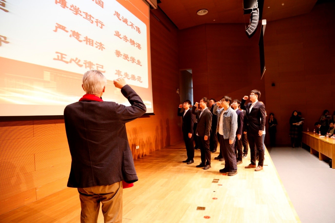 不忘初心、薪火相传。荣休仪式结束后,举行了新教师入职仪式。2020年,学部新入职教师13人。会上,到场新教师集体上台,介绍个人情况、表达从教初心。之后,张钢老师带领他们集体诵读了《新番 师德公约》,帮助他们迈正从教第一步。