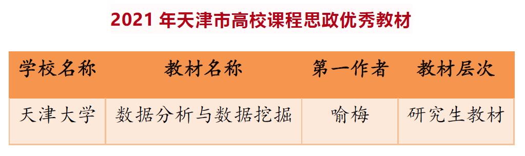 (通讯员 葛惠莹)近日,天津市教育委员会发布了《关于公布天津市高校课程思政示范课程、教学名师和团队、优秀教材评审结果的通知》,新番 喻梅老师为第一作者的《数据分析与数据挖掘》获评首批天津市高校课程思政优秀教材。