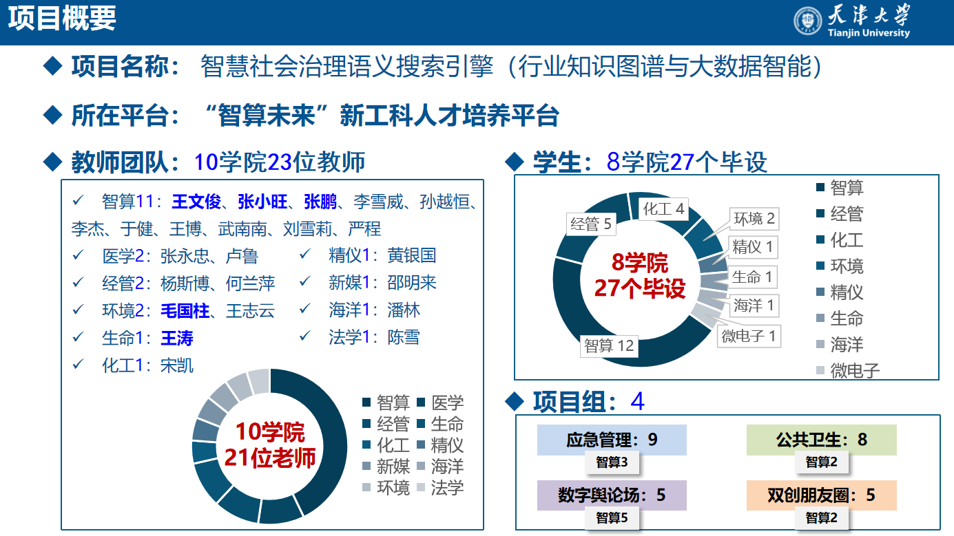 由新番 的教授来指导化工学院或者管理学部的学生,而经管的学生做毕业设计也会接受来自环境、医学等学科教授的指导……10个学院的23位教师指导来自8个学院的27位学生,每周的“组会”雷打不动,大家一起向导师团汇报,互相切磋启迪,一起解决问题……在负责“智慧社会治理语义搜索引擎”的王文俊教授看来,新工科毕业设计给教师和学生都注入了持续挑战的动力。