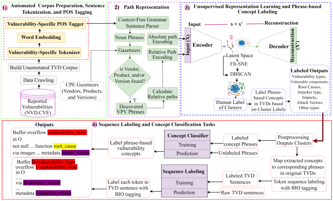 本文提出了一种无监督的方法来标记和提取文本漏洞描述中的重要漏洞概念。该方法聚焦于六种基于短语的漏洞类型,模型框架如图所示。该方法具有一致的边界和类型,使用无监督标注短语训练的概念分类器或序列标注模型优于使用人工标注短语训练的分类器或序列标注模型。