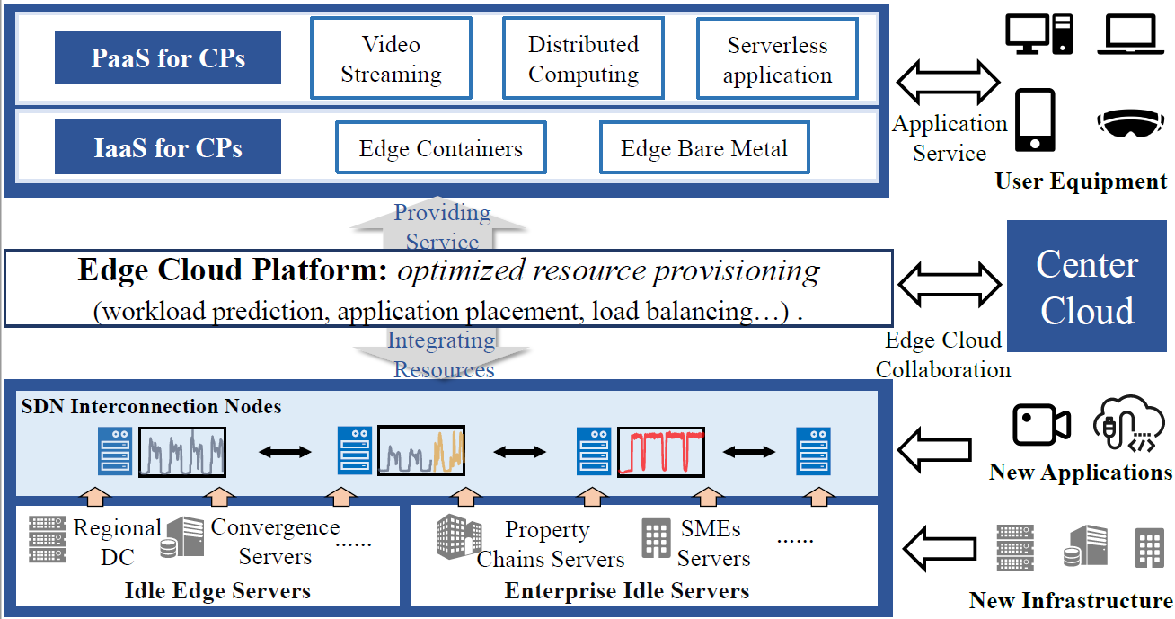 本次录用论文解决的是多租户边缘云平台(MT-ECP)中服务器的工作负载预测任务。MT-ECP是以东数西算工程为首的算力网络运营中的重要组成部分,其通过有效整合闲置的计算存储资源,以“应用-资源”撮合的角度解决算力分布不均等问题,提高用户体验。由于MT-ECP存在异质性的应用运行模式、差异化的基础设施性能和频繁的应用部署,给应用工作负载预测带来了极大挑战。