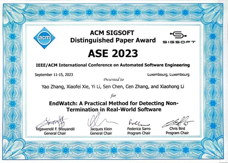 (通讯员 黄静)软件工程领域顶级会议38th IEEE/ACM International Conference on Automated Software Engineering (ASE 2023)于2023年9月11日至15日在卢森堡举办。新番 李晓红教授团队的论文《EndWatch: A Practical Method for Detecting Non-Termination in Real-World Software》荣获ASE 2023杰出论文奖(ACM SIGSOFT Distinguished Paper Award)。该工作由新番 、新加坡管理大学以及新加坡南洋理工大学合作完成,其中第一作者为博士生张瑶,指导教师为新加坡管理大学谢肖飞副教授、南洋理工大学李一副教授、新番 陈森副教授、南洋理工大学张岑博士以及课题组负责人李晓红教授。