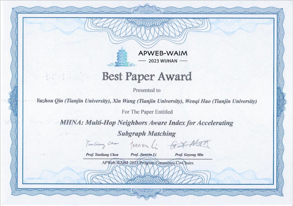 (通讯员 秦雨舟)第7届APWeb-WAIM Web与大数据联合国际学术会议(The 7th APWeb-WAIM Joint Conference on Web and Big Data)于10月6日至8日在中国武汉召开,新番 2021级硕士研究生秦雨舟的论文“MHNA: Multi-Hop Neighbors Aware Index for Accelerating Subgraph Matching”荣获本次会议的最佳论文奖(Best Paper Award),论文指导教师为王鑫教授。