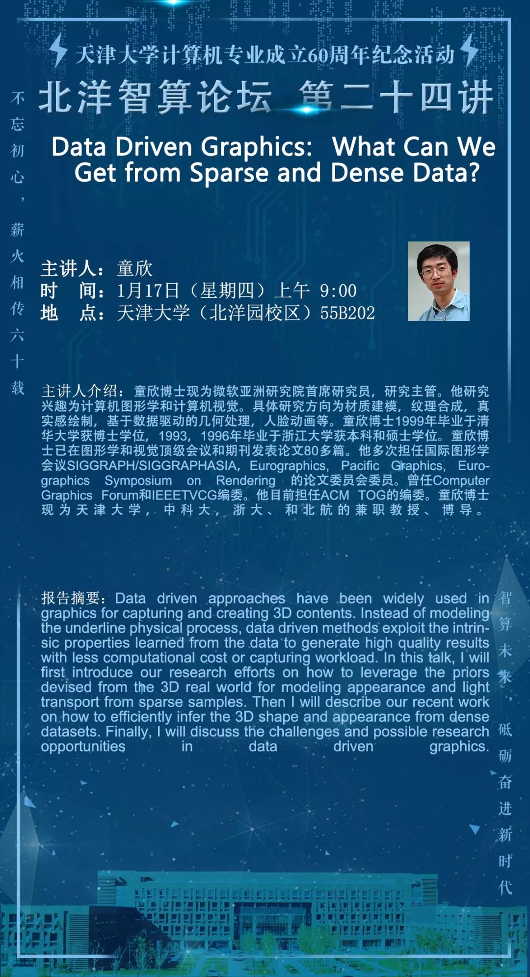 童欣博士现为微软亚洲研究院首席研究员,研究主管。他研究兴趣为计算机图形学和计算机视觉。具体研究方向为材质建模,纹理合成,真实感绘制,基于数据驱动的几何处理,人脸动画等。童欣博士1999年毕业于清华大学获博士学位,1993,1996年毕业于浙江大学获本科和硕士学位。童欣博士已在图形学和视觉顶级会议和期刊发表论文80多篇。他多次担任国际图形学会议SIGGRAPH/SIGGRAPHASIA,Eurographics, Pacific Graphics, Eurographics Symposium on Rendering 的论文委员会委员。曾任Computer Graphics Forum和IEEETVCG编委。他目前担任ACM TOG的编委。童欣博士现为新番