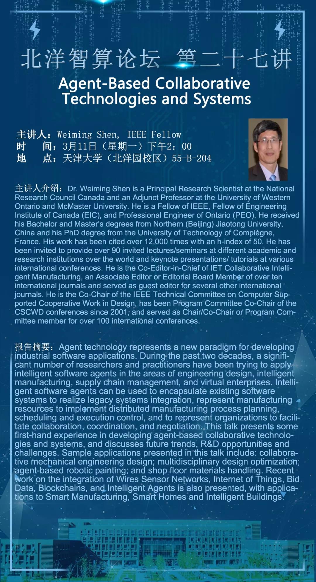 智能体技术代表了开发工业软件应用程序的新范例。在过去的二十年里,大量的研究人员和从业人员一直试图在工程设计,智能制造,供应链管理和虚拟企业等领域应用智能软件代理。在这些区域中,智能体可以被定义为一个软件系统,且与其他软件系统协作以解决一个复杂的问题。智能软件可用于封装现有的软件系统,实现遗留系统的集成,实现分布式制造工艺规划,调度和执行控制。本讲座介绍了在开发基于智能体的协作技术和系统的第一手经验,并讨论未来的发展趋势,R&D的机遇和挑战。本次演讲中提供的示例应用包括:协同机械工程设计;多学科设计优化;基于智能体的机器人绘画;和车间材料处理。