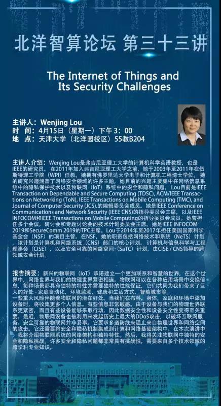 Wenjing Lou是弗吉尼亚理工大学的计算机科学英语教授,也是IEEE的研究员。在2011年加入弗吉尼亚理工大学之前,她于2003年至2011年在伍斯特理工学院(WPI)任教。她拥有博士学位。在佛罗里达大学的电气和计算机工程专业。她的研究兴趣涉及网络安全领域的许多主题,她目前的兴趣集中在网络信息系统中的隐私保护技术以及物联网(IoT)系统中的安全和隐私问题。
