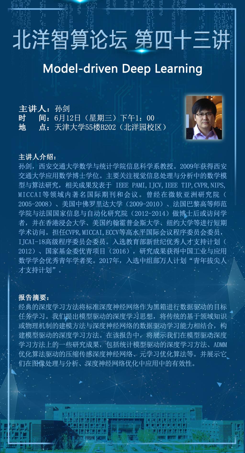 孙剑,西安交通大学数学与统计学院信息科学系教授。2009年获得西安交通大学应用数学博士学位。主要关注视觉信息处理与分析中的数学模型与算法研究,相关成果发表于IEEE PAMI, IJCV, IEEE TIP, CVPR, NIPS, MICCAI等领域内著名国际期刊和会议。曾经在微软亚洲研究院(2005-2008)、美国中佛罗里达大学(2009-2010)、法国巴黎高等师范学院与法国国家信息与自动化研究院(2012-2014)做博士后或访问学者,并在香港浸会大学、美国约翰霍普金斯大学、纽约大学等进行短期学术访问。担任CVPR, MICCAI, ECCV等高水平国际会议程序委员会委员,IJCAI-18高级程序委员会委员。入选教育部新世纪优秀人才支持计划(2012)、国家基金委优青项目(2016),研究成果获得中国工业与应用数学学会优秀青年学者奖。2017年,入选中组部万人计划“青年拔尖人才支持计划”。