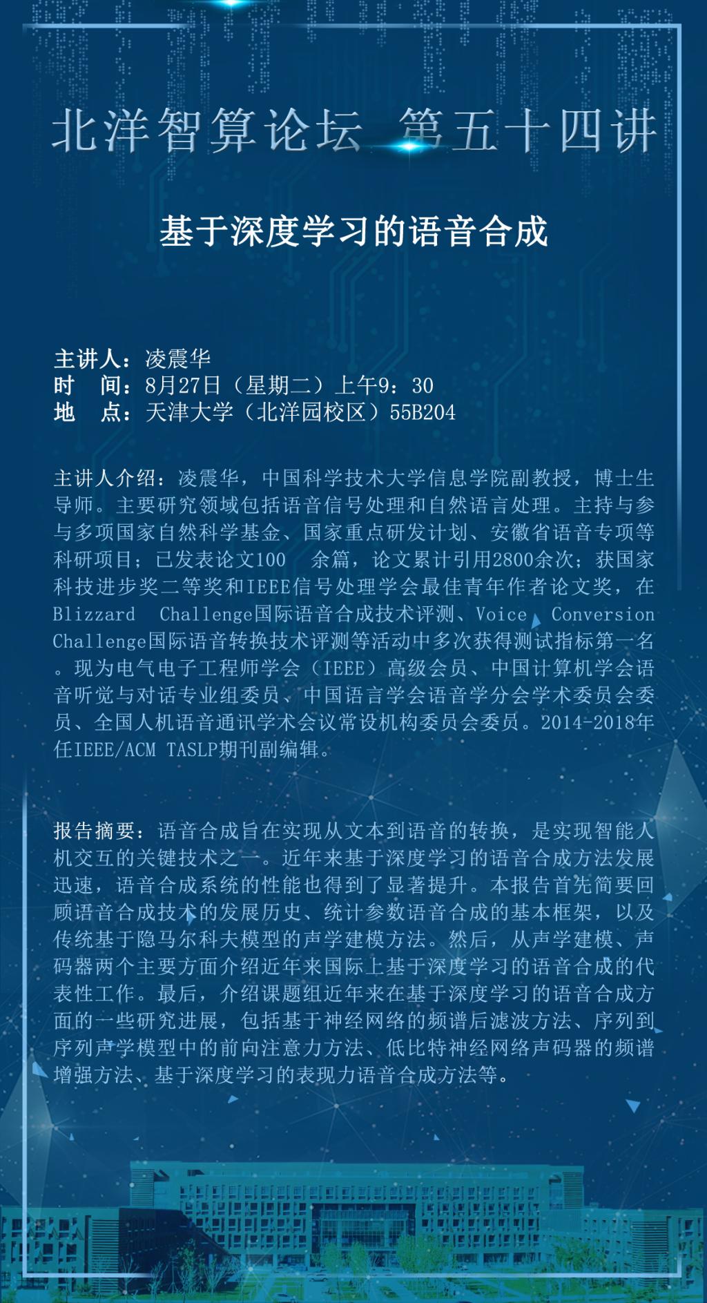 语音合成旨在实现从文本到语音的转换,是实现智能人机交互的关键技术之一。近年来基于深度学习的语音合成方法发展迅速,语音合成系统的性能也得到了显著提升。本报告首先简要回顾语音合成技术的发展历史、统计参数语音合成的基本框架,以及传统基于隐马尔科夫模型的声学建模方法。然后,从声学建模、声码器两个主要方面介绍近年来国际上基于深度学习的语音合成的代表性工作。最后,介绍课题组近年来在基于深度学习的语音合成方面的一些研究进展,包括基于神经网络的频谱后滤波方法、序列到序列声学模型中的前向注意力方法、低比特神经网络声码器的频谱增强方法、基于深度学习的表现力语音合成方法等。