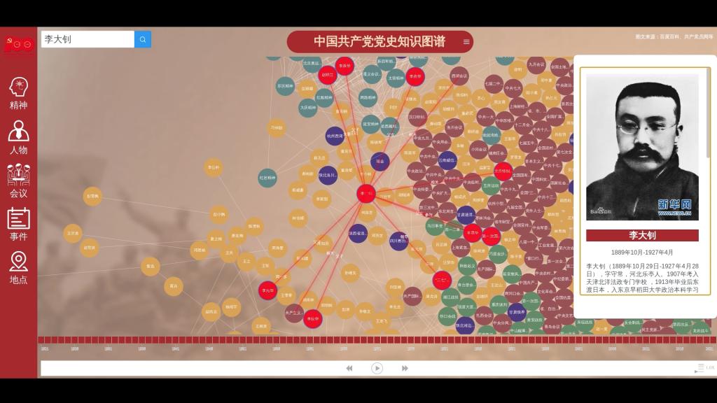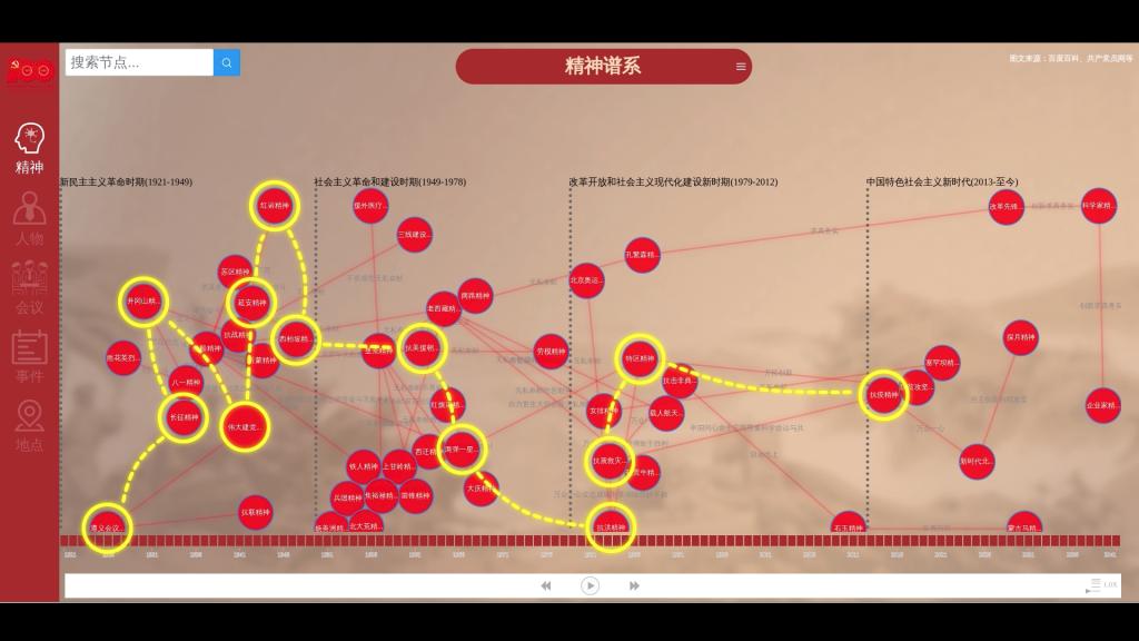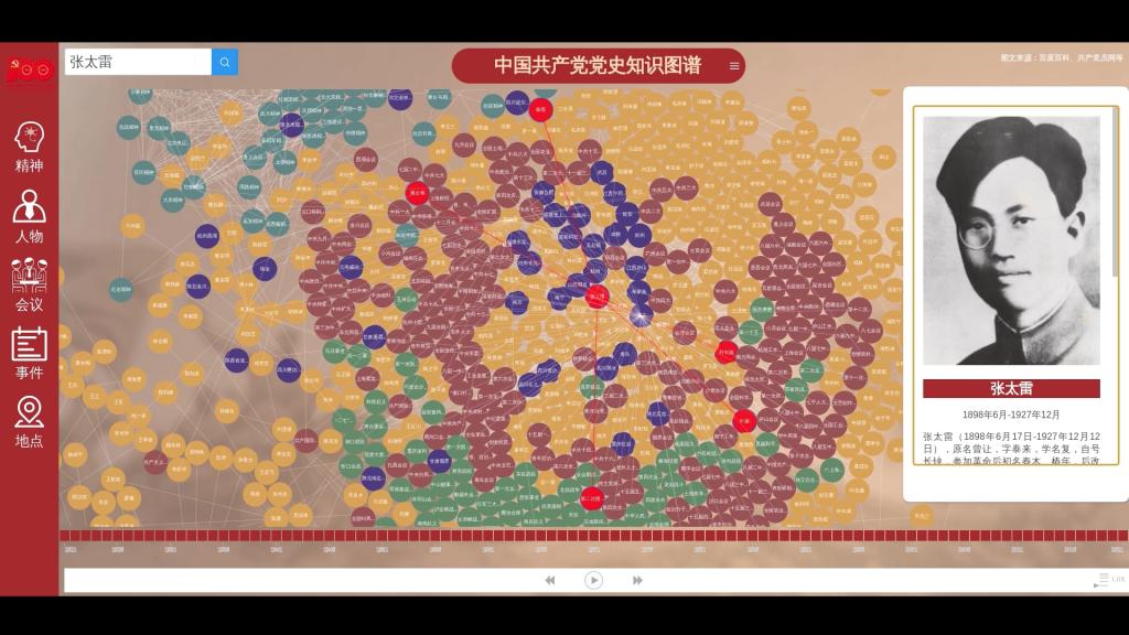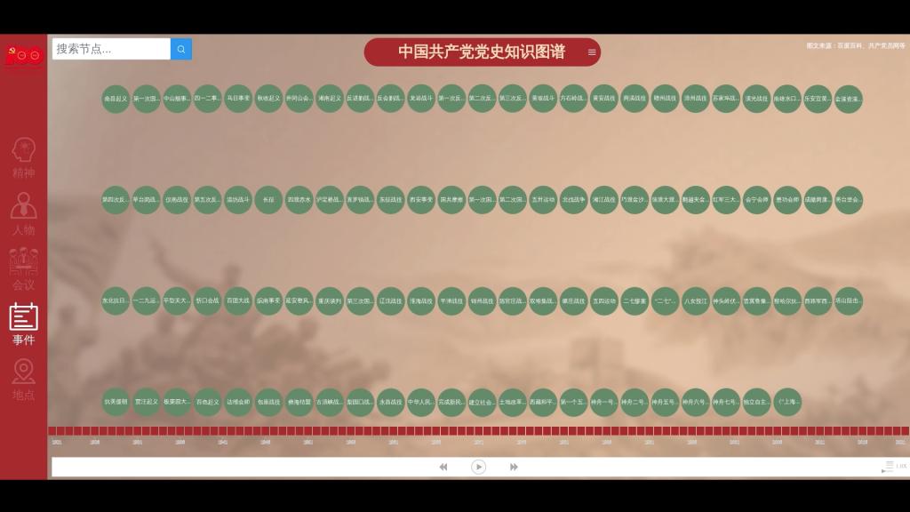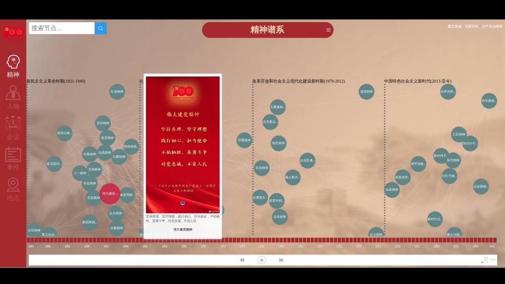 主界面采用不同颜色的节点生动呈现中国共产党发展历程中的关键人物、地点、事件、会议与精神。